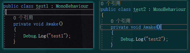 我这里新建了两个脚本,test1和test2,里面都在Awake中打印一句话