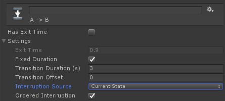By default, when we trigger the A->B transition, our state machine transitions towards B and nothing can keep it from reaching its destination. But if we go on the A->B transition inspector and change the interruption source from “None” to “Current State”, our journey from A to B can be interrupted by some triggers on state A.
