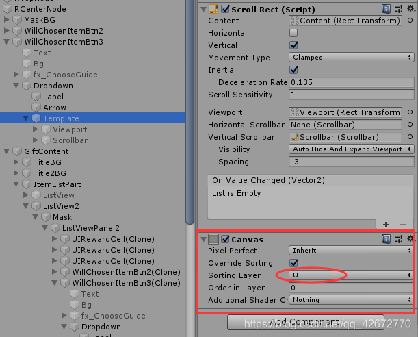 在Template上新添加一个画布并设置所需要的SortingLayer