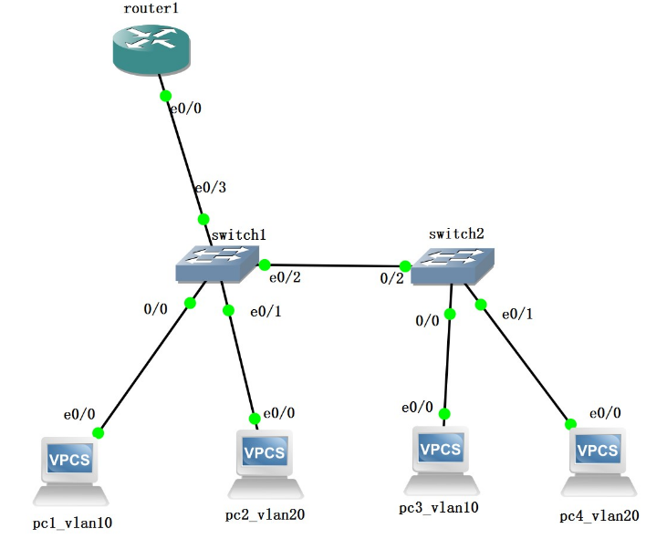 switch1(config-if)#exit //将两台交换机之间的链路设置为trunk链路