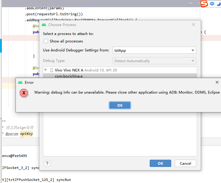 Warning:debug info can be unavailable.Please chose other application using ADB