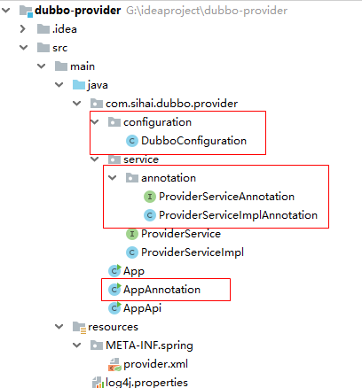 4. 暴露接口(xml 配置方法)首先,我们在我们项目的 resource 目录下创建 META-INF.spring 包,然后再创建 provider.xml 文件,名字可以任取哦,如下图。