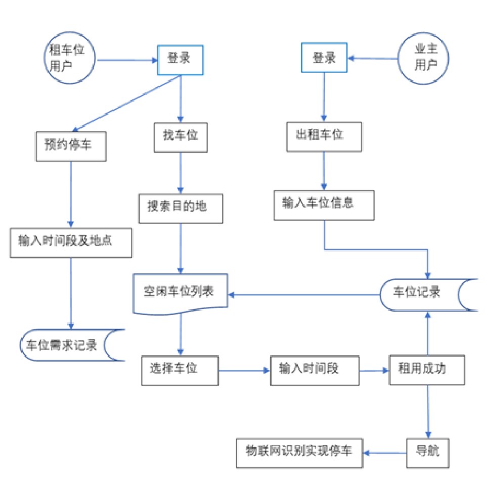 整体流程:停车车主,录入基本信息(实名认证,车牌)预约下单,设置停车时间(开始计时收费)。到达目的地,通过闸机,(闸机也是物联网设备,预约订单会将车牌自动录入闸机,车辆驶出,删除车辆信息,结束订单打上标签(驶出小区))通过app地图导航,寻找从车位(地库车位或者地面车位,都对车位进行编号);到达车位手机操作解锁。停车。驶出车位,车闸升起,上传数据,结算订单打上标签(驶出车位)。