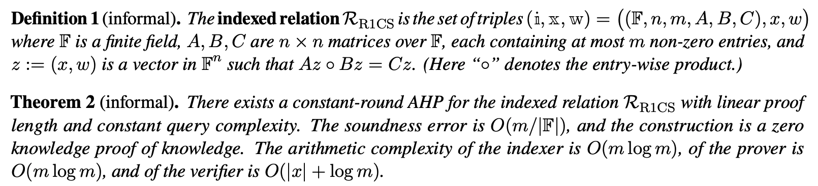 - 1)AHP(an algebraic holographic proof (AHP) for rank-1 constraint satisfiability (R1CS))——为information-theoretic primitive:具有linear proof length和constant query complexity。待验证的statement以encoded form存在,可实现fast verification。