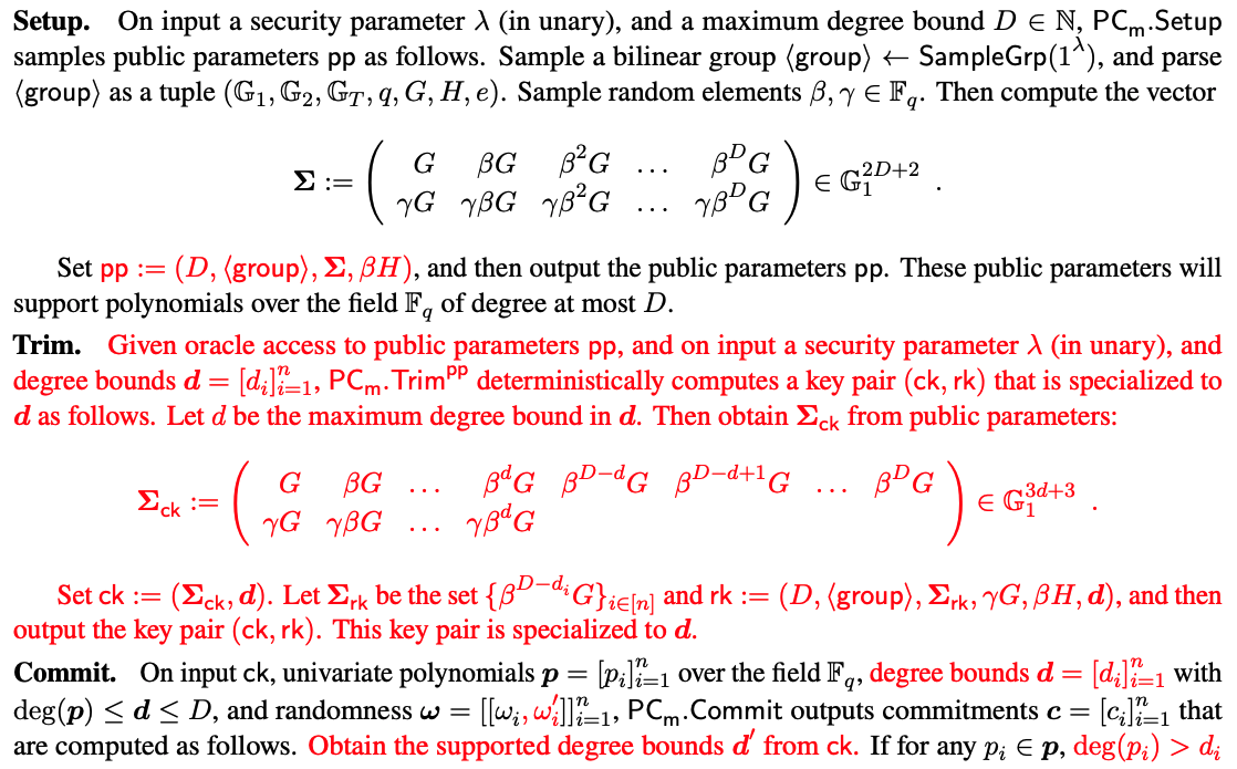 - P C . C o m m i t PC.Commit PC.Commit:输入为committer key c k ck ck、a list of polynomials p p p with respective degree bounds d d d,输出为a set of commitments c c c。