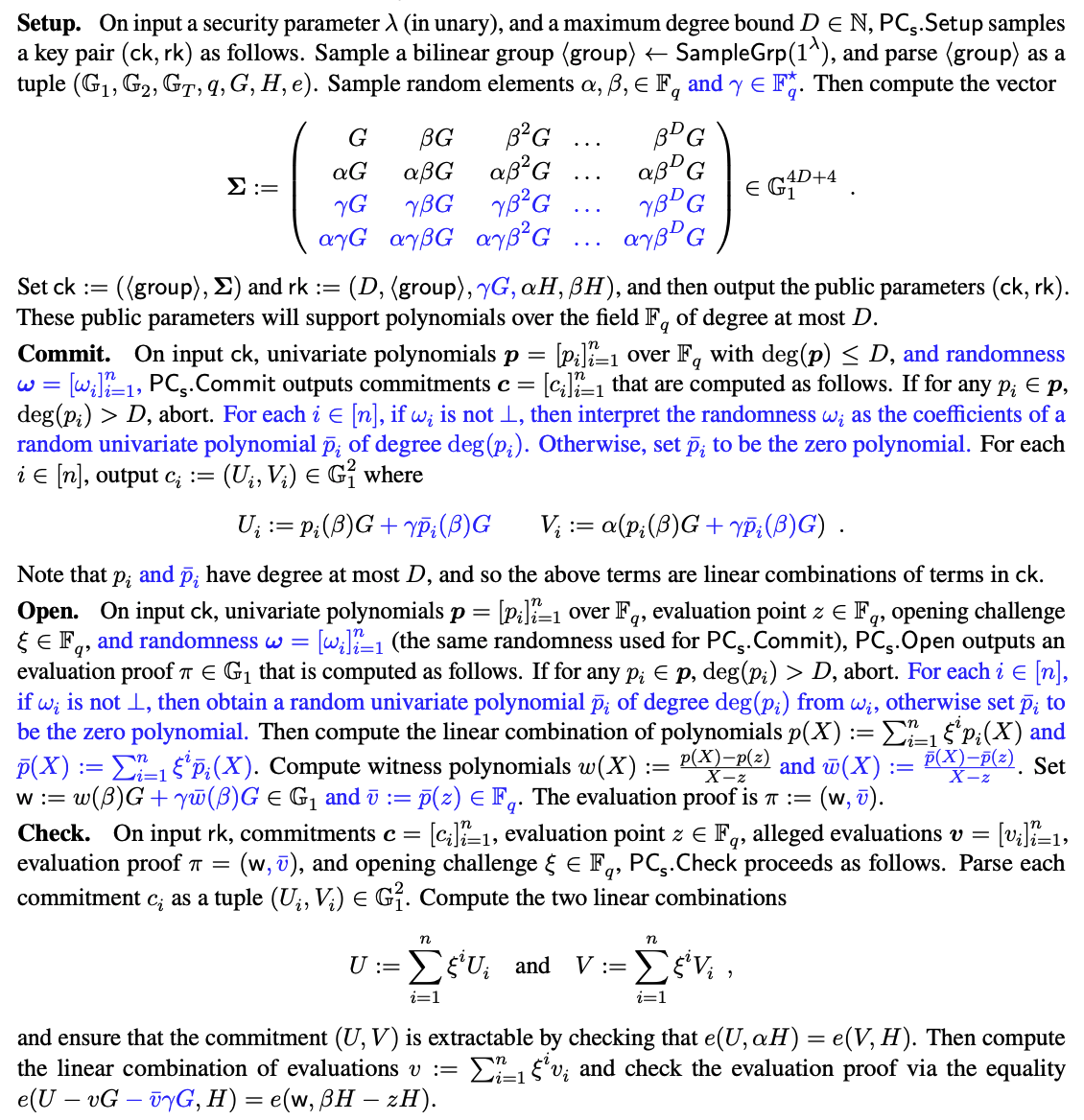 基于[Gro10]的knowledge assumption构建的extractable polynomial commitment scheme为: 【其中蓝色字体通过引入randomness实现的PC具有hiding属性。】