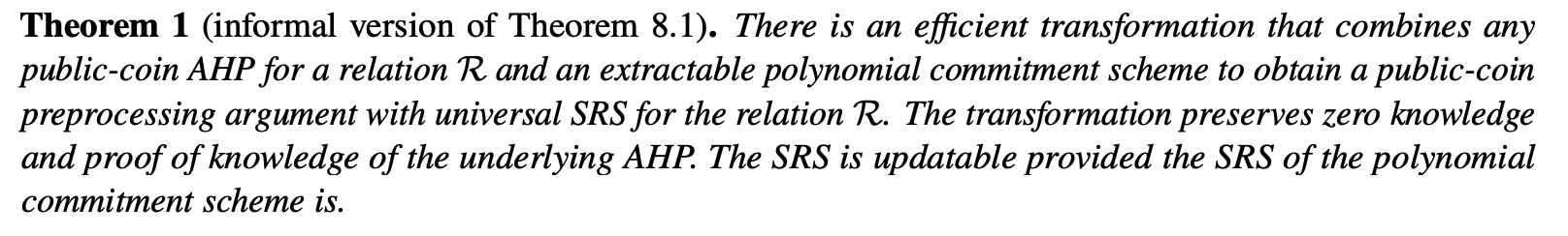 通过合适的extractable polynomial commitment,可将任意public-coin AHP 编译转换为 相应的具有universal (and updatable) SRS的preprocessing argument。