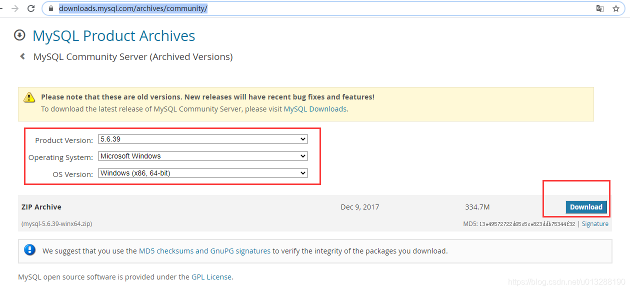 接下来要干的很简单,官网下载mysql5.6,链接:https://downloads.mysql.com/archives/community/,我电脑64位的,所以我下了64位的版本。
