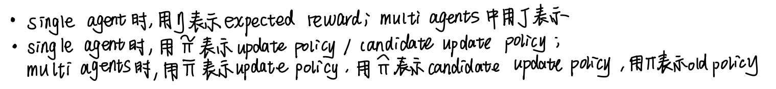 🌴 表示差异ps:notion definition不同,一方面是本文作者下了multi agents时的 Q-value Function 和 Advantage Function 的新定义(已写于上一part),另一方面不同论文表示意思相同时可能用了不同符号(部分总结于这儿)。为了下面对比两篇论文数学公式时候顺畅一点,才写了这一部分。其实没什么影响,只是很正常地不同论文中表示不同