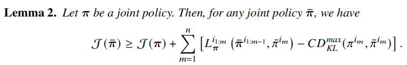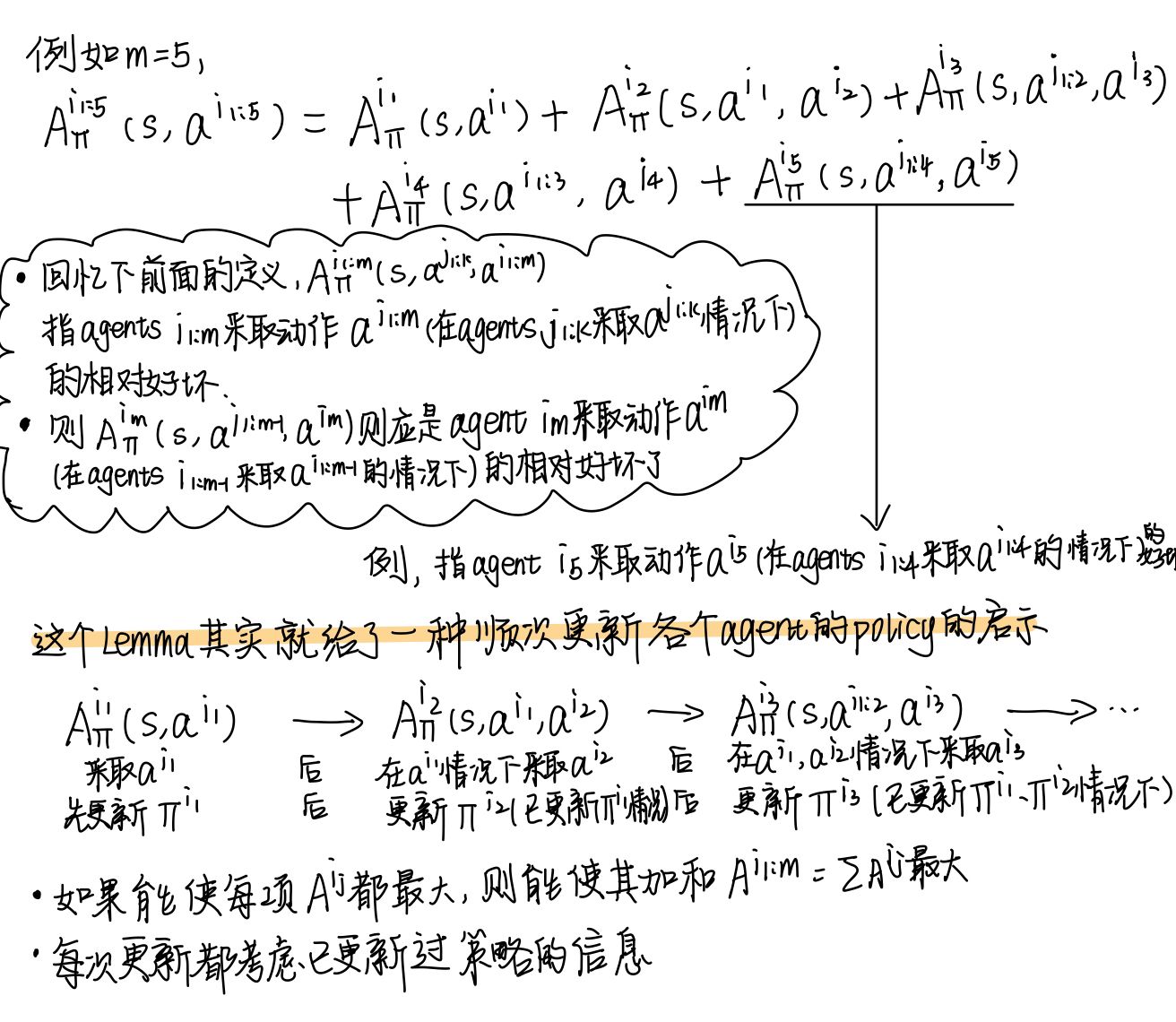 其提出并证明了multi-agent advantage decomposition lemma,并基于此提出了多智能体的 sequential policy update scheme (update the policy of agent one by one)