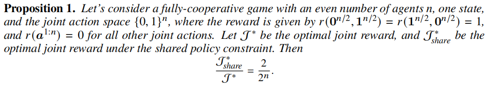 则在这个例子中,parameter sharing can lead to a suboptimal outcome that is exponentially-worse with the increasing number of agents.