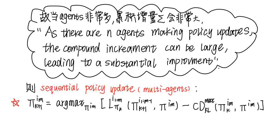对比这两个词,再理解下HATRPO (H -> heterogenous) 的含义。将借由顺次更新各个智能体的策略实现这一设想