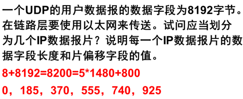例题 以太网的MTU为1500字节,将IP数据报封装到以太网帧中除去20字节的首部,一次最多只能传输1480字节 UDP数据字段8192字节,首部字段8字节共8200字节 8200/1480=5 8200%1480=800 故应当划分为6个IP数据报片,前五个为数据字段长1480,最后一个数据字段长800 片偏移以8字节为单位,1480/8=185,可得:0,185,370,555,740,925