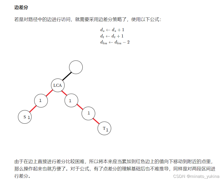 图为oiwiki的描述,在点差分中,不仅要维护lca,同时还要维护lca的父亲,因为路径是包含lca这个点的. 然而在边差分上,由于把点权下放,所以lca的父亲不必再维护。