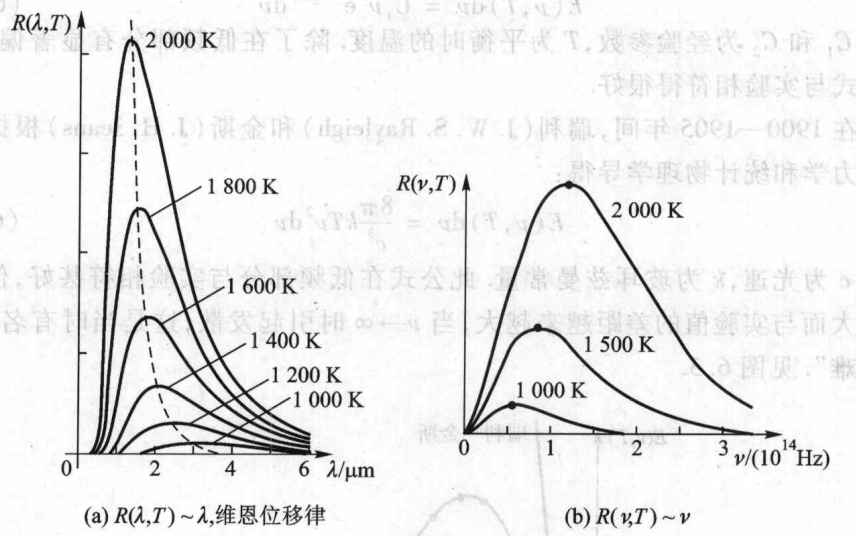 类似的,辐射本领 R ( ν , T ) R(\nu,T) R(ν,T),即单位时间黑体上所辐射的频率在 ν \nu ν附近单位频率范围内能量随 ν \nu ν的变化规律。可以发现,极大值所对应的 ν m \nu_m νm与黑体热力学温度成正比。