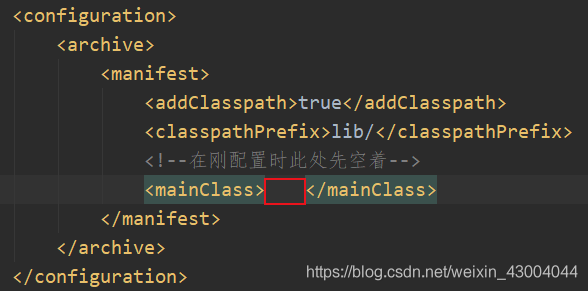 然后在pom.xml文件中配置main方法所在类路径,即将刚才复制的内容粘贴到之前留下的空白处