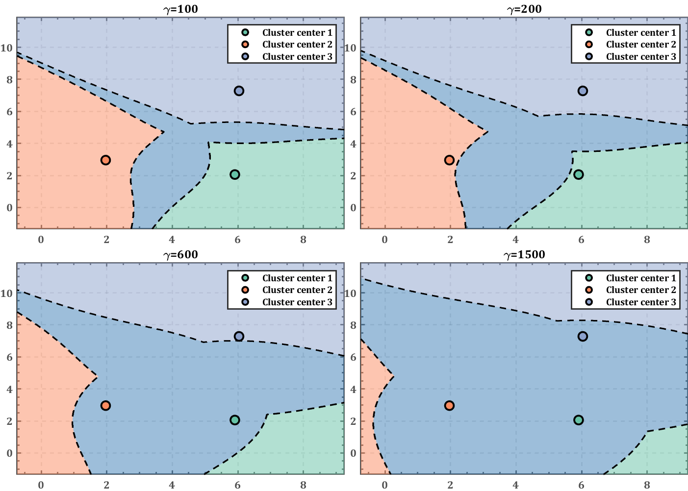 gamma=[100,200,600,1500]; for g=1:4 subplot(2,2,g) hold on [~,idx2Region2]=min(XV,[],2); Len=length(idx2Region2); minXV=XV(sub2ind(size(XV),(1:Len)',idx2Region2))+gamma(g); tXV=XV;tXV(sub2ind(size(XV),(1:Len)',idx2Region2))=inf; tBool=all((tXV-minXV)>0,2); idx2Region2(~tBool)=K+1; % 绘制聚类区域方法二 RGrid=zeros(size(x1G(:))); GGrid=zeros(size(x1G(:))); BGrid=zeros(size(x1G(:))); for i=1:K+1 RGrid(idx2Region2==i)=colorList(i,1); GGrid(idx2Region2==i)=colorList(i,2); BGrid(idx2Region2==i)=colorList(i,3); end CGrid=[]; CGrid(:,:,1)=reshape(RGrid,size(x1G)); CGrid(:,:,2)=reshape(GGrid,size(x1G)); CGrid(:,:,3)=reshape(BGrid,size(x1G)); surf(x1G,x2G,zeros(size(x1G)),'CData',CGrid,'EdgeColor','none','FaceAlpha',.5) % 绘制边缘线 contour(x1G,x2G,reshape(idx2Region2,size(x1G)),1.5:1:(K+1),... 'LineWidth',1.5,'LineColor',[0,0,0],'LineStyle','--') scatterSet=[]; strSet{K}=''; for i=1:K scatterSet(i)=scatter(C(i,1),C(i,2),80,'filled','o','MarkerFaceColor',... colorList(i,:),'MarkerEdgeColor',[0,0,0],'LineWidth',1,'LineWidth',1.9); strSet{i}=['Cluster center ',num2str(i)]; end % 添加图例 legend(scatterSet,strSet{:}) % 坐标区域修饰
