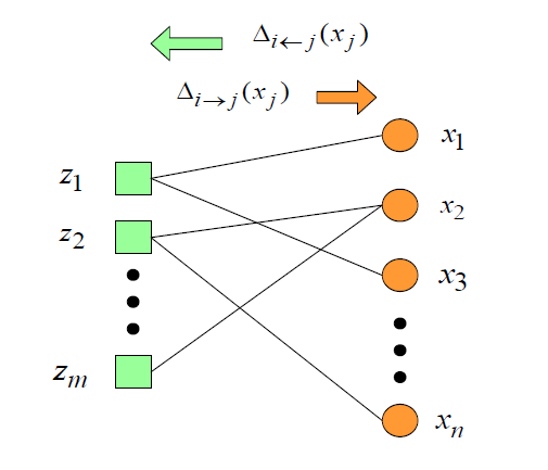 \begin{aligned} &\Delta_{i \rightarrow j}\left(t, x_{j}\right) \\ &=\text { const }+\log \int_{\left\{x_{r}\right\}_{r \neq j}} p_{Y \mid Z}(y_{i} \mid \underbrace{a_{i j} x_{j}+\sum_{r \neq j} a_{i r} x_{r}}_{\triangleq z_{i}}) \prod_{r \neq j} e^{\Delta_{i \leftarrow r}\left(t, x_{r}\right)} . \end{aligned}
