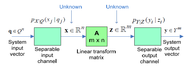 模型背景我们旨在解决上图这样的问题, 已知输入 q \mathbf{q} q (先验信息), 已知输出 y \mathbf{y} y(后验信息), 已知变换矩阵 A \mathbf{A} A, 反推出变量 x \mathbf{x} x。 以AWGN信道举例: y = z + w = A x + w \mathbf{y}=\mathbf{z}+\mathbf{w}=\mathbf{A} \mathbf{x}+\mathbf{w} y=z+w=Ax+w y \mathbf{y} y已知而我们试图反推出 x \mathbf{x} x。 此时, 如果 x \mathbf{x} x有一些先验分布信息, 如稀疏分布, 即 x \mathbf{x} x中只有少量元素非零, 那么, 便可以通过概率的方式, 以GAMP算法进行求解。
