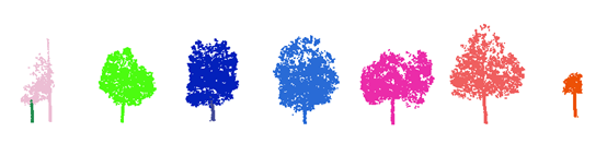 在从原始点云中准确提取到树木后,需要对树木点云进行单体化处理,叫做单木分割,树木之间存在一定距离,通过欧式距离聚类即可进行简单的单木分割处理。 这里通过对聚类后的不同点集进行形状,面积大小,高度的判断,可以进一步去除噪声。