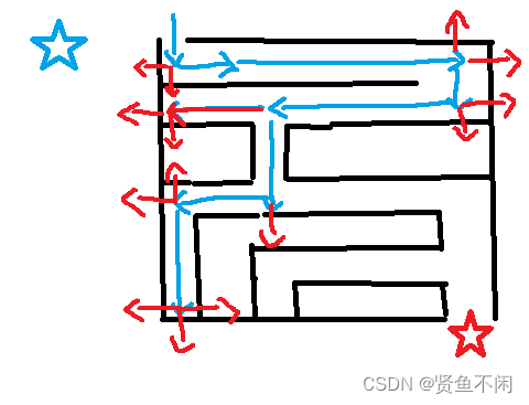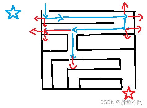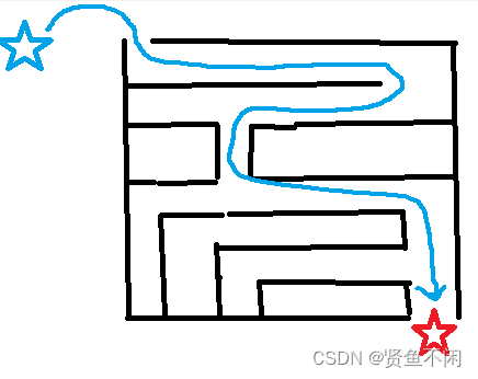 以深度为优先的搜索算法,可以理解为一条路走到黑 图例解释 ==现在需要从蓝色五角星走到红色五角星 理想走法: