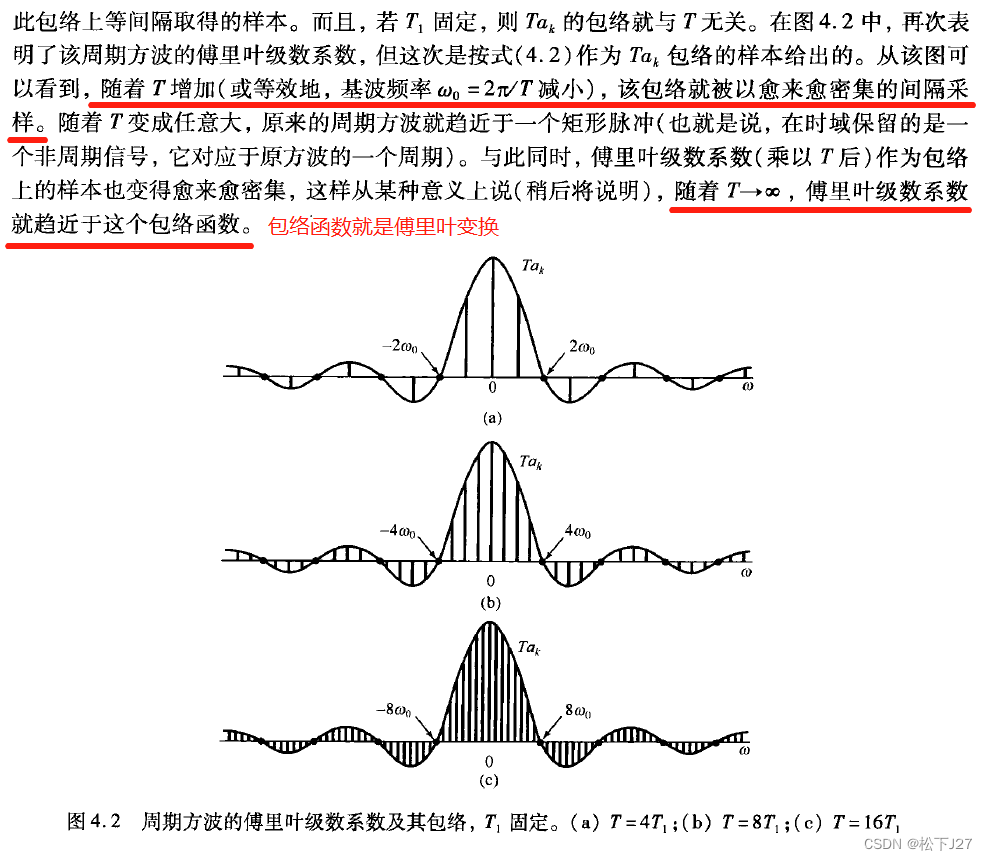 原始信号的长度为2*T1,随着基波周期T的不断增加4*T1,8*T1,16*T1(这也意味着周围方波信号中,方波与方波之间的间隔越来越大),采样间隔2Pi/T越来越小。