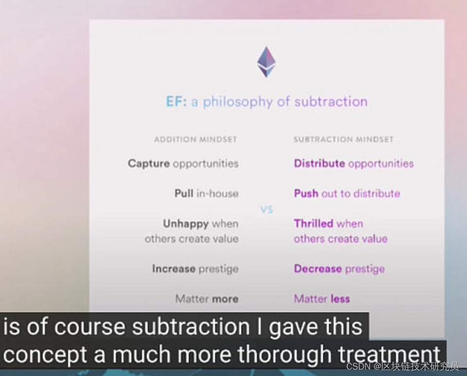 EF 的执行总裁 aya 还有在开幕式里提到了以太坊基金会提到了资深管理里要做到“克制”的理念,最小化治理,distribute opportunities,让外围组织有更多上场机会等等。其真实应对上述问题的解药,至少从理念上。