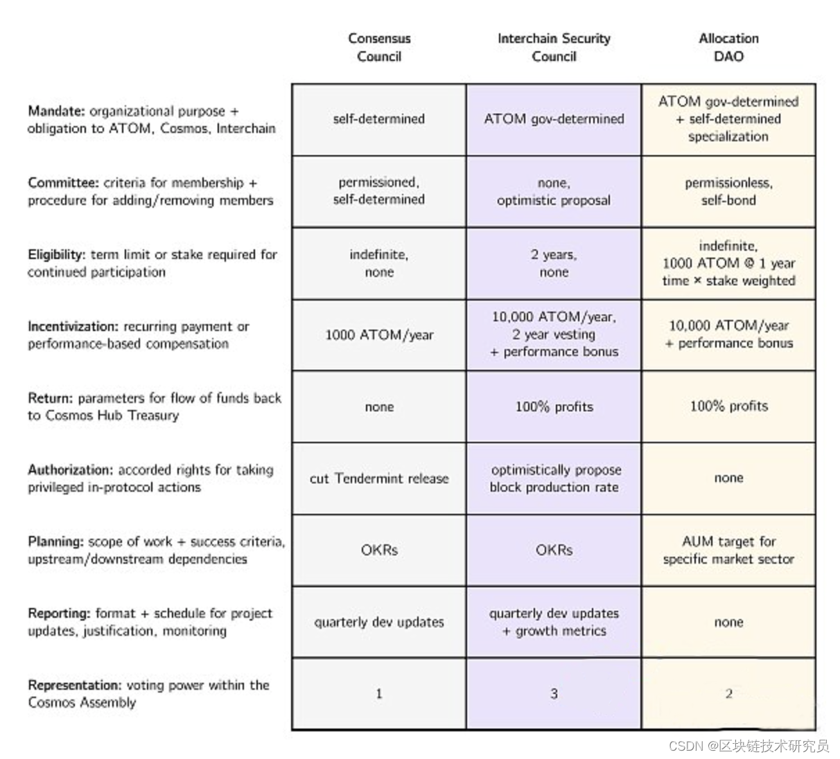 这里提及了 Cosmos 集会(The Cosmos Assembly)这个概念,是一个代表 Hub 社区利益的组织机构。它由 ATOM 持有者定义总体章程,DAO 可以成为理事会,并会被添加到章程中,为特定主题提供资源和授权,Cosmos 集会则由理事会的代表组成。