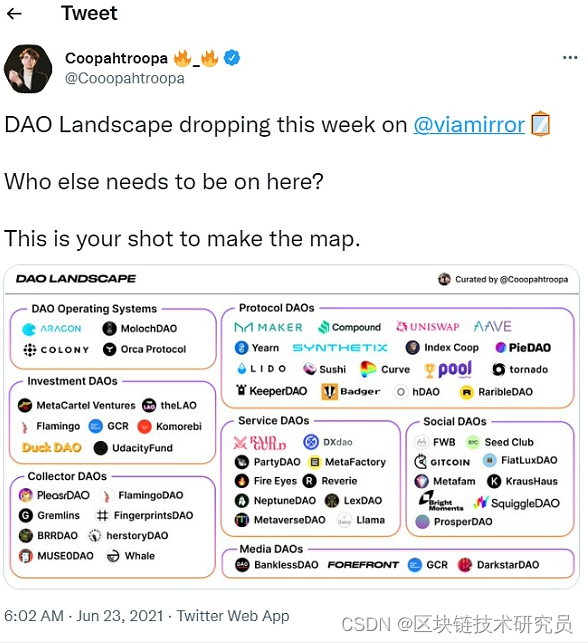 这篇文章中提到的 DAO 也许不够全面。我肯定错过了一些。如果没有提到你的 DAO,你可能错过了这条推文 ↓