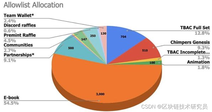 TBAC有6个TBAC剧集,拥有所有6个剧集被称为“全集”,拥有所有6个剧集,就可以有8个Chimplist位置。在Snapshot(是一种基于 IPFS 去中心化存储系统的投票工具,许多加密项目使用它来投票其用户群)中拥有1个剧集,可获得1个Chimplist名额。创世Chimpers是通过空投奖励给全集持有者,同时也会拍卖出售。在Snapshot中拥有一个创世Chimpers的人,可以获得6个黑猩猩位置。动画作品最初出售给全集持有人,然后抽奖给社区。拥有1个动画作品可获得1个抽奖名额。