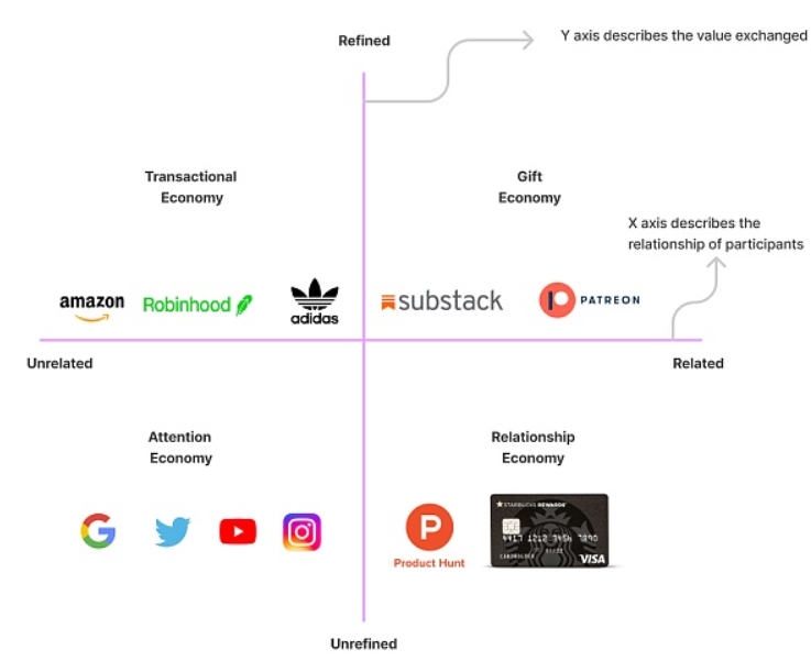 NFT的今世让我们用图表来剖析不同经济模式下,品牌价值量化的不同。x 轴表示关系,关系指的是交易中当事人之间的关系。关系越密切,就越难进行高度量化和充分谈判的交易。在 y 轴上,我们细化分解下经济互动。它指的是卖方在交易前确定价值的程度,以及客户接受交易的速度。想想亚马逊的送货服务,你知道你买的是什么,以及什么时候它会到达你的门口。