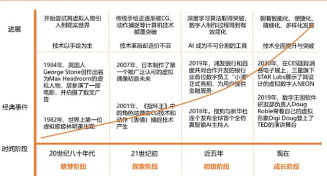 虚拟数字人从最早的手工绘制到现在的 CG(Computer Graphics,电脑绘图)、人工智能合成,虚拟数字人大致经历了萌芽、探索、初级和成长四个阶段。