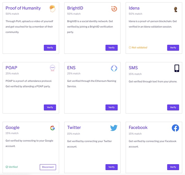 二次方投票的弱点在于必须依赖严格的身份证明机制才能保证其公正。如果允许伪造身份,其运行结果将与1T1V毫无差别。在身份识别上,Gitcoin 采用了绑定社交账号,连接 DID 服务等多元化的方式。用户每完成一项,即可获得一定数量的积分,积分达到 150 分之后可达成身份认证。