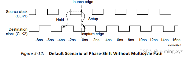 在相移为负的情况下,如图5-14所示,在两个时钟域之间,用于setup和hold检查的启动和捕获边缘类似于前面的那些(单一时钟域,无相移)。
