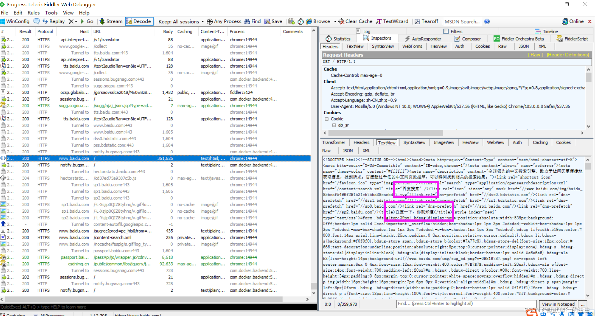 - 使用原生浏览器访问“https://www.baidu.com/”,fiddler成功抓取到https的数据。