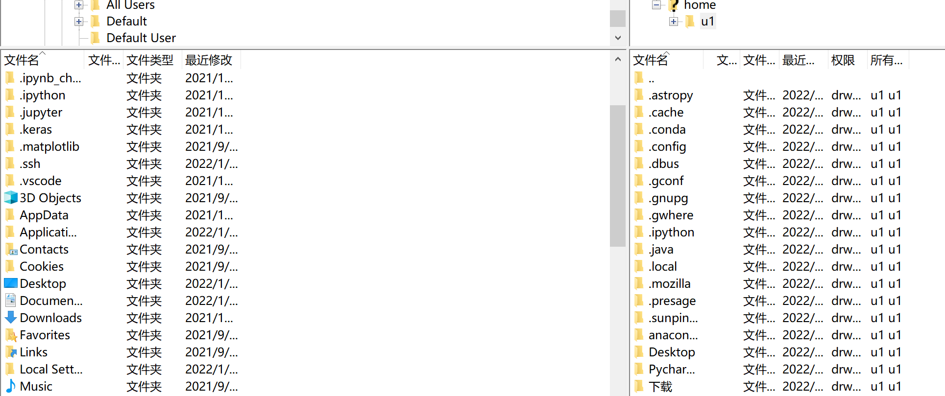 之后就可以看到连接成功了,左边是本机,右边是服务端(之后就可以通过拖动文件来实现文件的拷贝)