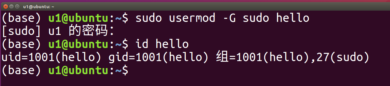 可以看到hello用户没有管理员权限,我们需要给hello用户设置一个sudo附加组,之后其才可以有管理员权限。(需要使用usermod修改用户信息)