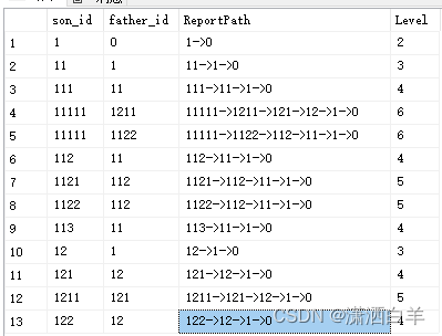 如下图,查询每个节点之间的关系,以及层级 表中存储的数据如下: