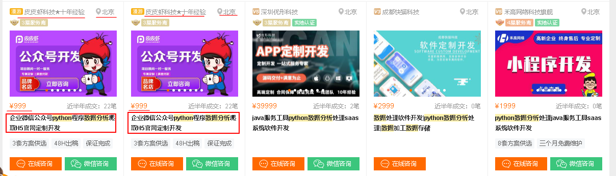 #拿到每一个服务商的div divs = html.xpath("/html/body/div[6]/div/div/div[2]/div[5]/div[1]/div") for div in divs: #全路径 #prices = div.xpath("./div/div/a[2]/div[2]/div[1]/span[1]/text()") #根据div的class属性快速定位位置 price = div.xpath(".//div[@class='service-price clearfix']/span[1]/text()")[0].strip("¥") #去除价格前面的¥符号 title = "".join(div.xpath(".//div[@class='service-title']/p//text()")) company_name = div.xpath("./div/div/a[1]/div/p/text()")[1].strip() #列表中有换行符,取列表中的第二个内容,并且去除换行符 loc = div.xpath("./div/div/a[1]/div/div/span/text()") print(price) print(title) print(title) print(company_name)