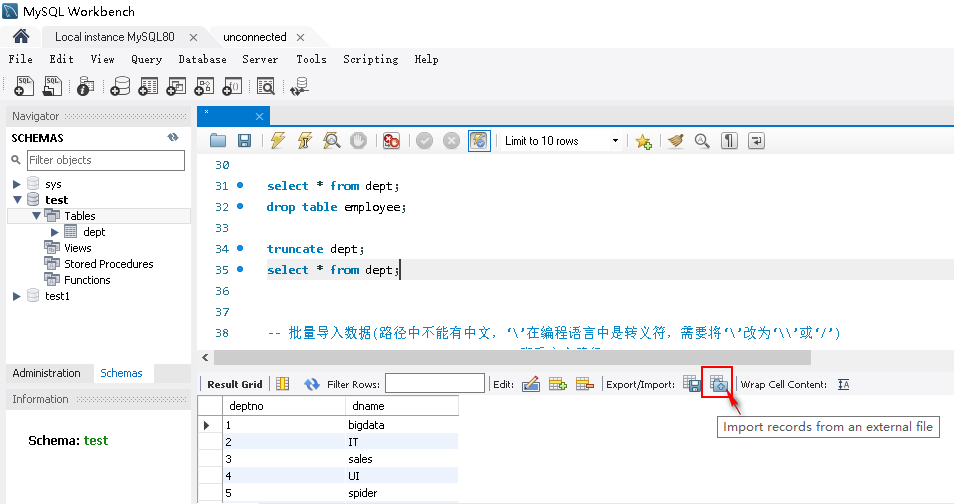在导入数据前我们肯定对数据进行了基础的了解,知道了都有哪些列 在mysql中创建数据库test,并创建数据表dept(创建基础的表结构)