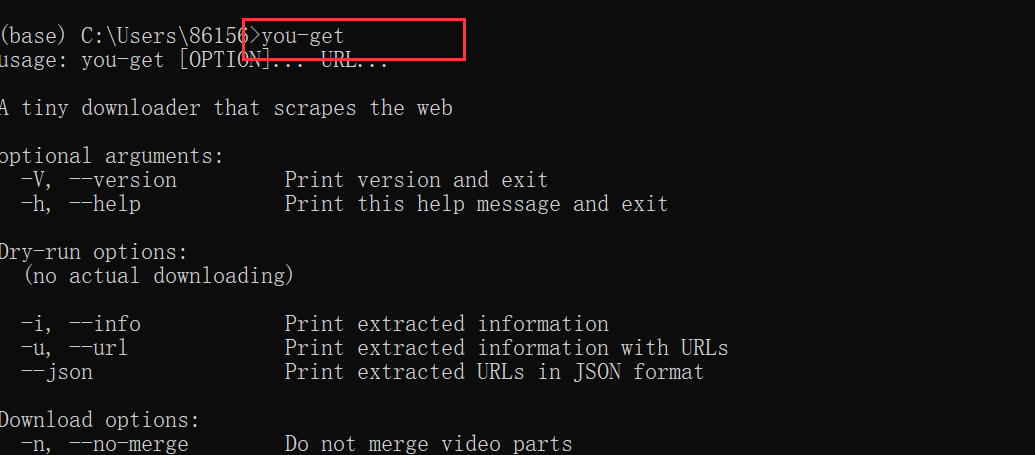输入you-get测试是否安装成功,如果安装成功如下图所示。