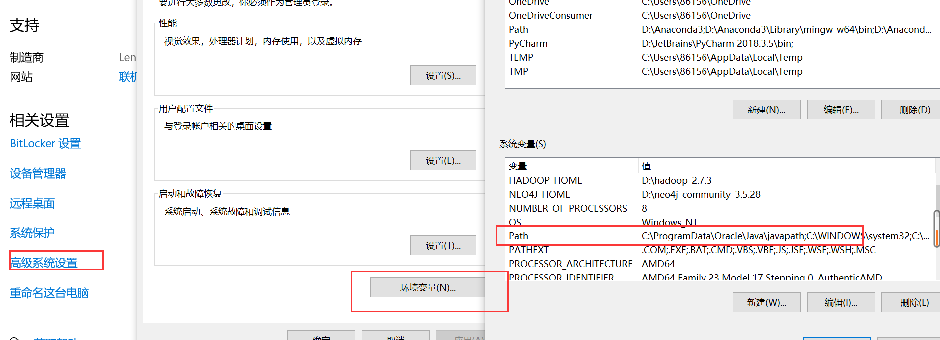 【右键此电脑】=>【属性】=>【高级系统设置】=>【高级】=>【环境变量】=>【在系统变量内容框中找到 变量名为Path 的一行,双击】/【或者在用户变量里添加也可以】 =>【Python安装目录追加到变值值中,用 ; 隔开】