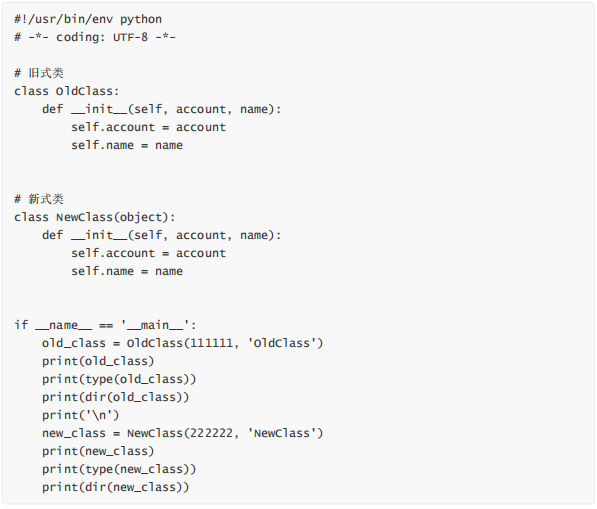 Python 在版本的迭代中,有一个关于类的历史遗留问题,就是新式类和旧式类的问题,具体先看以下的代码: 可以看到,这里使用了两者中不同的方式定义类,可以看到最大的不同就是,新式类继承了 object 类,在 Python2 中,我们定义类的时候最好定义新式类,当然在 Python3 中不存在这个问题了,因为 Python3 中所有类都是新式类。