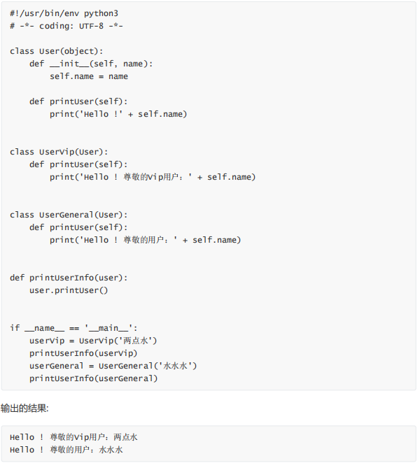 看下面的实例,来了解多态: 可以看到,userVip 和 userGeneral 是两个不同的对象,对它们调用 printUserInfo 方法,它们会自动 调用实际类型的 printUser 方法,作出不同的响应。这就是多态的魅力。