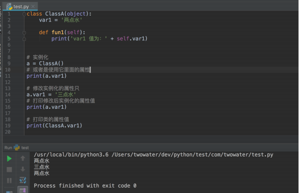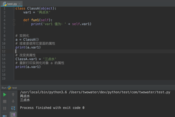 - 类的使用,变成了先通过 实例名 = 类() 的方式实例化对象,为类创建一个实例,然后再使用 实 例名.函数() 的方式调用对应的方法,使用 实例名.变量名 的方法调用类的属性