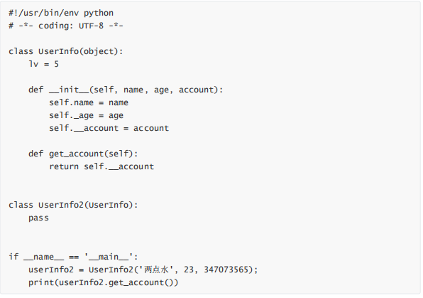 一个类继承了父类后,可以直接调用父类的方法的,比如下面的例子, UserInfo2 继承自父类 UserInfo ,可以直接调用父类的 get_account 方法。