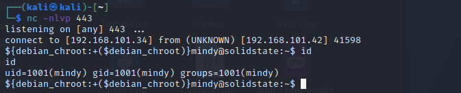 mindy用户登录之后没有获得shell,但是攻击机的443端口获得反弹shell了。