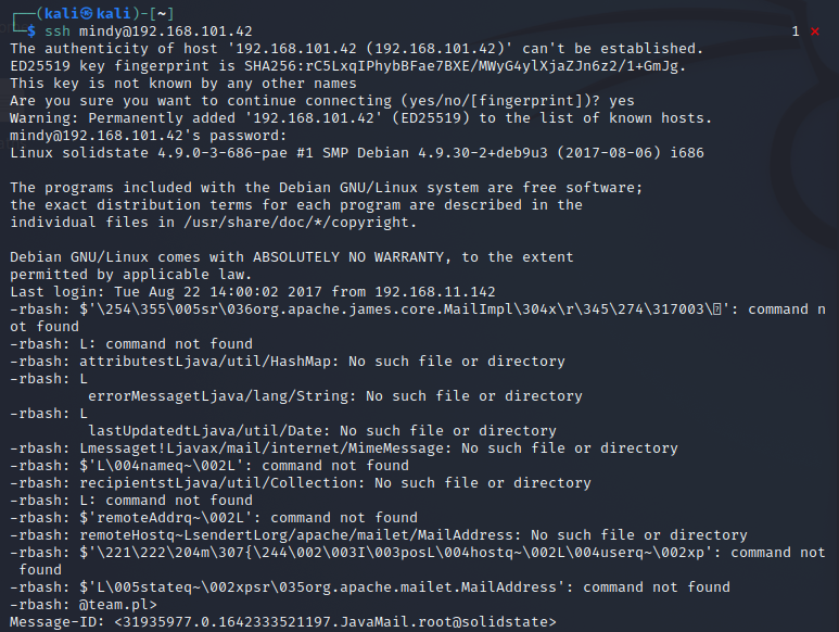 用mindy账户登录,发送LIST命令发现有两封邮件,用RETR命令依次查看两封邮件内容,发现账号密码在第二封邮件中:mindy/P@55W0rd1!2@