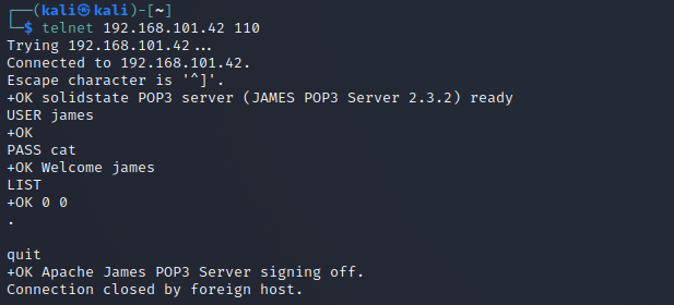 nmap扫描---->默认账号登录James Remote Admin修改用户密码---->登录pop3端口查看邮件内容找到系统登陆的账户密码---->ssh登录/利用Apache James Server 2.3.2远程命令执行漏洞获得反弹shell----->查找权限777的文件,并用定时任务提权
