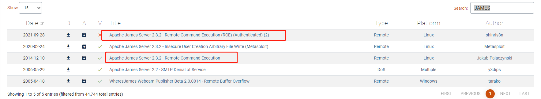在Exploit Database - Exploits for Penetration Testers, Researchers, and Ethical Hackers搜索“ JAMES”,可以搜到远程命令执行漏洞,如下图红框所示,可把我高兴坏了。(我最终使用的是2021-09-28的那个)